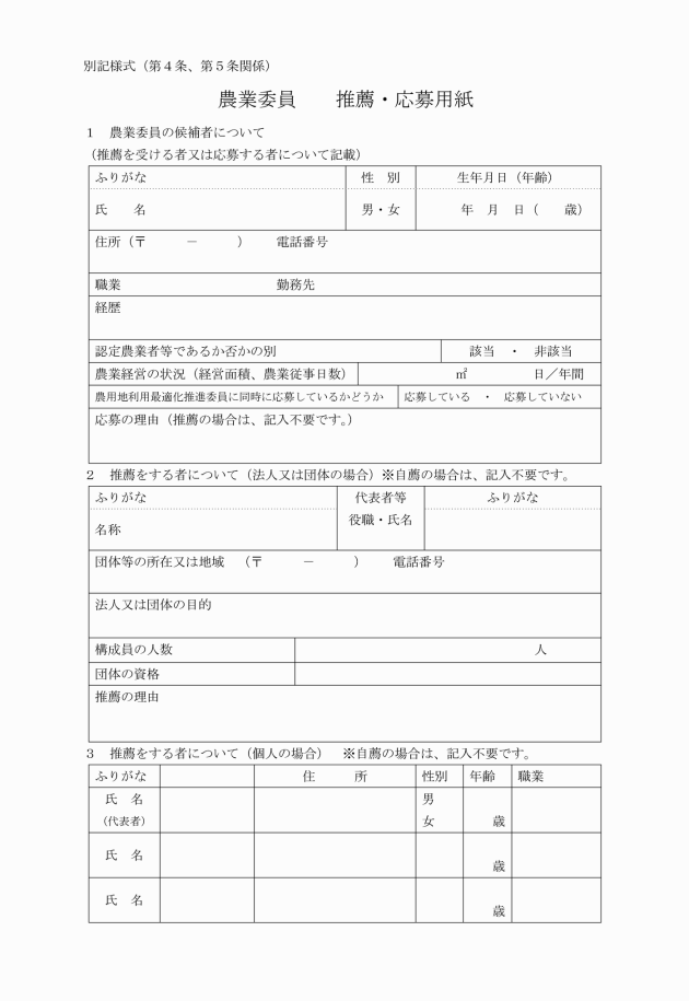 第2条 農業委員会等に関する法律(昭和26年法律第88号。以下「法」という。)第8条の規定に基づき、相良村長(以下「村長」という。)が委員を任命するときに行う法第9条の規定に基づく委員候補者の推薦及び募集についての方法は、次のとおりとする。