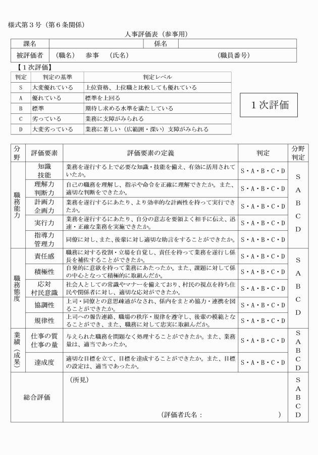 第2条 人事評価の対象となる職員は、村の一般職(地方公務員法第3条第2項の一般職をいう。)の職員とする。ただし、他の地方公共団体等への派遣、研修、留学その他の事情により、評価者の服務監督のもとに勤務した期間が、第3条で定める期間の2分の1に満たない職員の人事評価については、村長が別に定める。