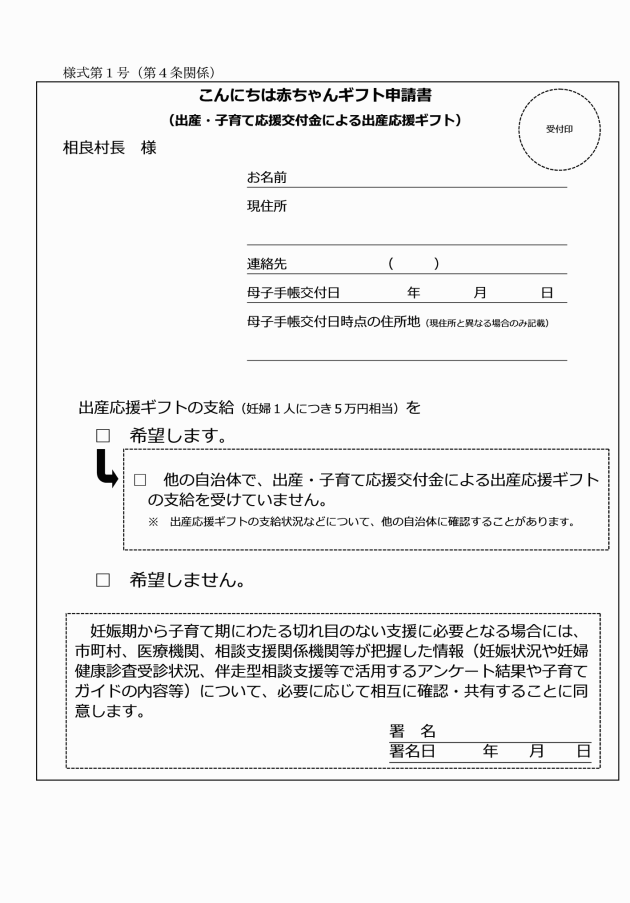 第5条 出産応援ギフトの支給を受けようとする遡及支給妊婦(以下この条において「申請予定者」という。)は、本村に妊娠中の方へのアンケートを提出し、かつ、こんにちは赤ちゃんギフト申請書(出産・子育て応援交付金による出産応援ギフト)を提出し支給の申請を行う。