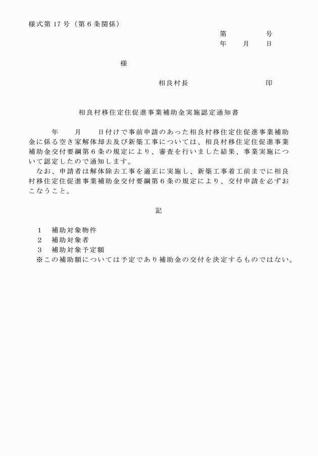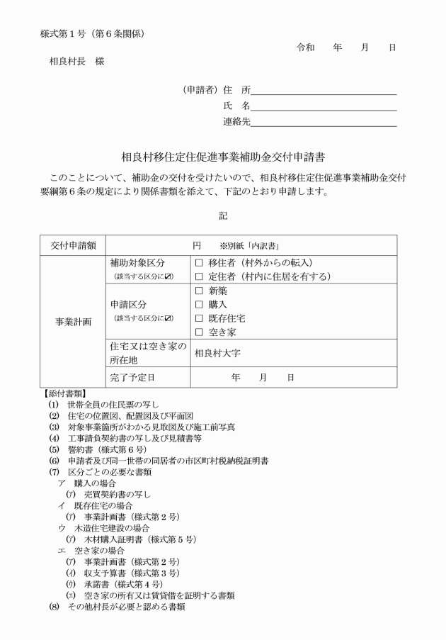 第7条 補助金の額の決定を受けた申請者は、事業計画の内容に重大な変更が生じたとき又は内容変更等により交付決定額を変更する必要が生じたときは、相良村移住定住促進事業補助金変更申請書(様式第8号)に次に掲げる書類を添えて村長に提出し、その承認を受けなければならない。